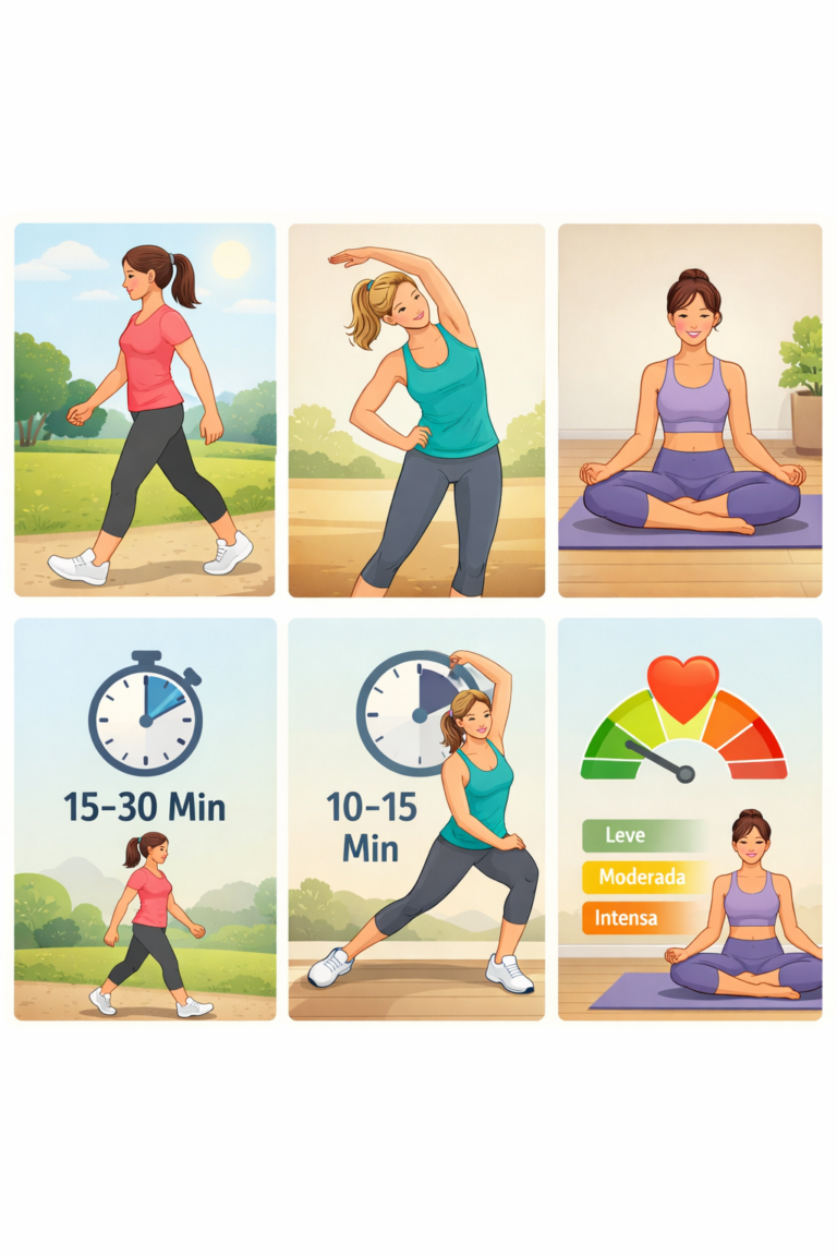 Template de exercícios simples com caminhadas, alongamentos e yoga para melhorar a circulação, reduzir retenção de líquidos e aliviar dores.